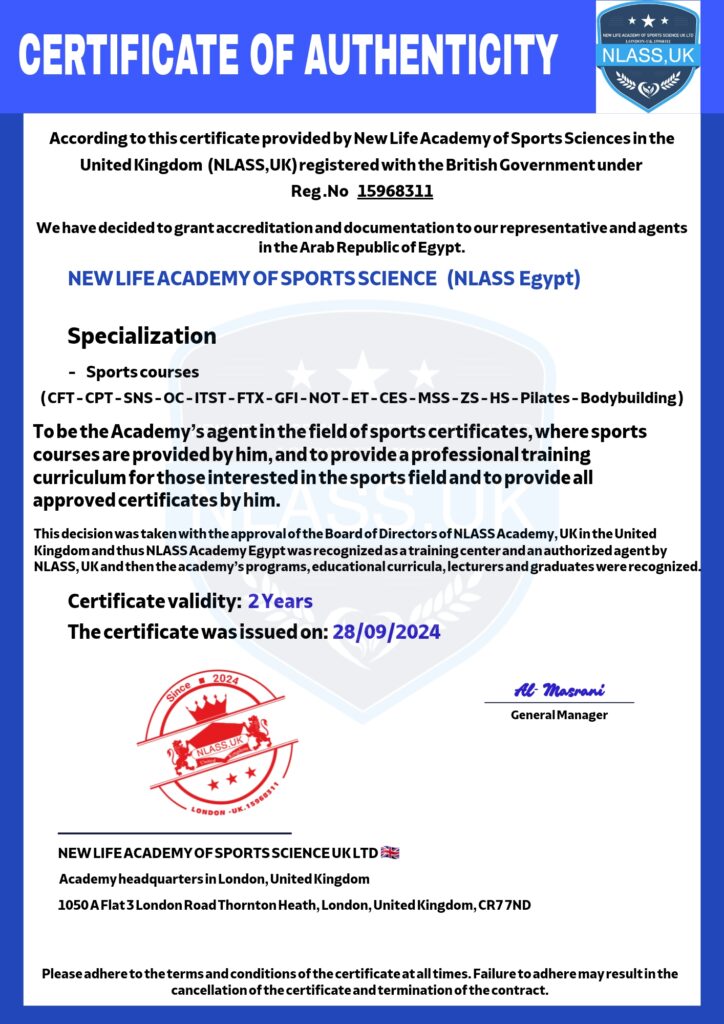 According to this certificate provided by NLASS,UK, registered with the British government with number 15968311. We have decided to grant accreditation and documentation to our representatives and agents in the Arab Republic of Egypt. This decision was taken with the approval of the Board of Directors of NLASS Academy, UK in the United Kingdom and thus NLASS Academy Egypt was recognized as a training center and an authorized agent by NLASS, UK and then the academy’s programs, educational curricula, lecturers and graduates were recognized.